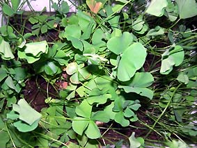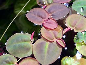 ベトナムクローバー 水上葉・水中葉ともに四つ葉ですが、水上葉は普通の四つ葉ですが、水中葉は片方に偏り、手のひらのような形になります。 |