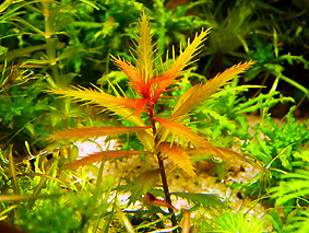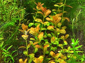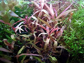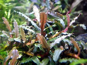 オランダプラント 水草の王様とも言われる人気種です。 育成難度自体は高くないと思いますが、 水質変化に敏感で、水換え後に頂葉が縮れたり、茎の生長方向が変わって曲がった姿になるなど綺麗に真っ直ぐ育てるのが難しく、育成環境によって発色や姿がめまぐるしく変わるので奥の深い水草と言えます。 我が家では水槽の状態を計るバロメーターとして各水槽に入れてます。条件良ければCO2添加なしでもぐんぐん成長します。 難易度 ★★★★☆ 光量 ★★★★☆ |